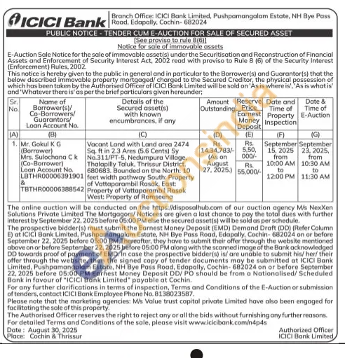 Vacant Land with Land area 2474 Sq. ft in 2.3 Ares (5.6 Cents) Sy No.311/PT-5, Nedumpura Village, Thalapilly Taluk, Thrissur District, 680683. Bounded on the North: 10 feet width pathway South: Property of Vattaparambil Rasok, East: Property of Vattaparambil Rasak West: Property of Ramseena