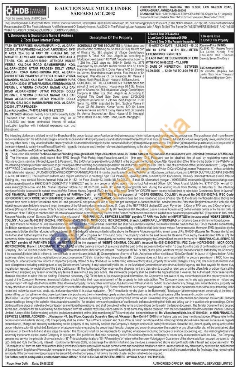 All that piece and parcel of land containing house area 58.1 Sq. Meters part of Khasra No. 361 situated at Village Gambhirpura pargana & Tehsil Kol Distt. Aligarh as according to porgana & Tens Mortgage Deed dialed 14/07/2017 nd at book no 1 Zi2ld No 7223 page no. 395/414 Serial No. 3776 rexecuted by Seitendra Kumar Verma S/O S Laxmi Narayan Verma and Simit. Dolyy Verma W/O S Jendra Kr. Verma. Boundaries as are under East-House of Srl Netrapal, West-House of Sn Rajendra Kr. Verma & Others, thers, North-Road, North Road, South House House of of Sri Balmukand SCHEDULE OF THE SECURITIES II All that piece and parcel of land containing House Area 264 Sq Meters part of Khasra No. 361 situated at Village Gambhepura Pargana & Tehsil Koil Dott. Aligarh as According to Original Tite Deed Sale Deed dated 23/09/2009 registered at Book No. 1 Zild No. 2765 Page No. 21/38 Serial No. 6797 executed by Smt. Sadhna Verma in Favor Of Sn Jitendra Kumar Verma SO Sri Laxmi Narayan Verma and Smt. Dolyy Verma WIO Sn Jitendra Kr. Verma Bounded as East- House of Sri Netrapal West-Rasta 15 Feet, North-Road, South-Mortgagor