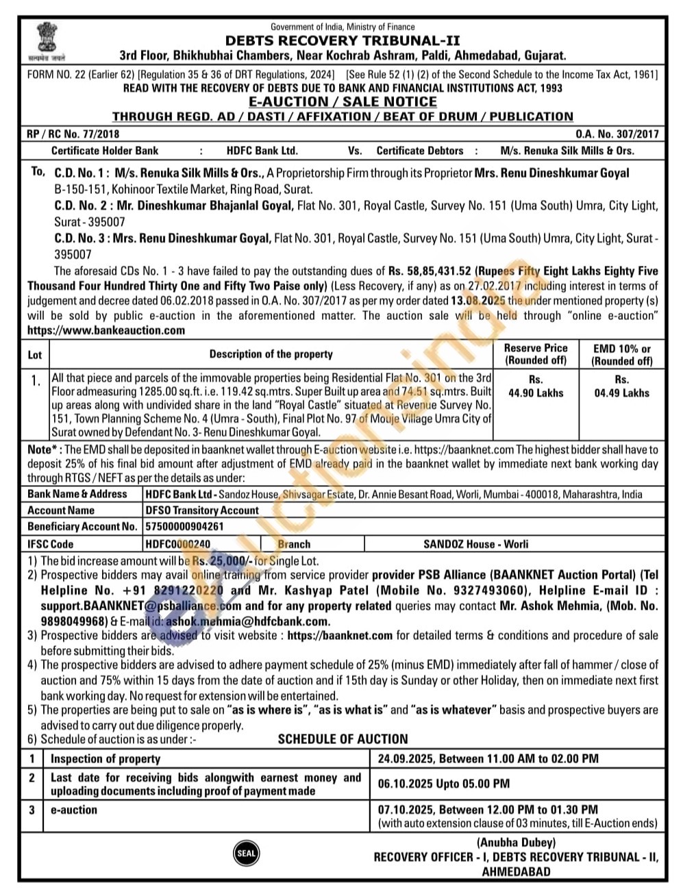 All that piece and parcels of the immovable properties being Residential Flat No. 301 on the 3rd Floor admeasuring 1285.00 sq.ft. i.e. 119.42 sq.mtrs. Super Built up area and 74.51 sq.mtrs. Built up areas along with undivided share in the land "Royal Castle" situated at Revenue Survey No. 151, Town Planning Scheme No. 4 (Umra-South), Final Plot No. 97 of Mouje Village Umra City of Surat owned by Defendant No. 3- Renu Dineshkumar Goyal.