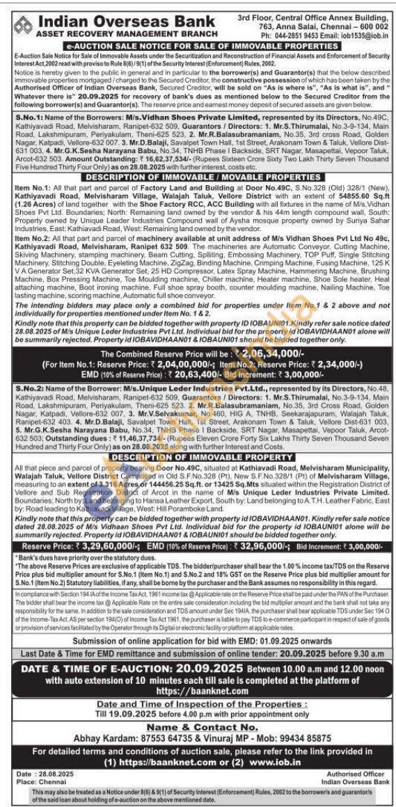 Item No.1: All that part and parcel of Factory Land and Building at Door No.49C, S.No.328 (Old) 328/1 (New) Kathiyavadi Road, Melvisharam Village, Walajah Taluk, Vellore District with an extent of 54855.60 Sq.ft (1.26 Acres) of land together with the Shoe Factory RCC, ACC Building with all fixtures in the name of Mis.Vidhan Shoes Pvt Ltd. Boundaries: North: Remaining land owned by the vendor & his 44m length compound wall, South: Property owned by Unique Leader Industries Compound wall of Aysha mosque property owned by Suriya Sahar Industries, East: Kalhiavadi Road, West: Remaining land owned by the vendor.