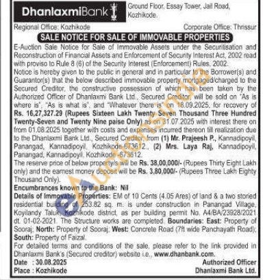 EM of 10 Cents (4.05 Ares) of land & a two storied residential building of 253.82 sq. m is under construction in Panangad Village, Koyilandy Taluk, Kozhikode district, as per building permit No. A4/BA/23928/2021 dt. 01-02-2021 The Structure works are completed. Boundaries: East: Property of Sooraj, North: Property of Sooraj. West: Concrele Road (7ft wide Panchayath Road), South: Property of Faizal.