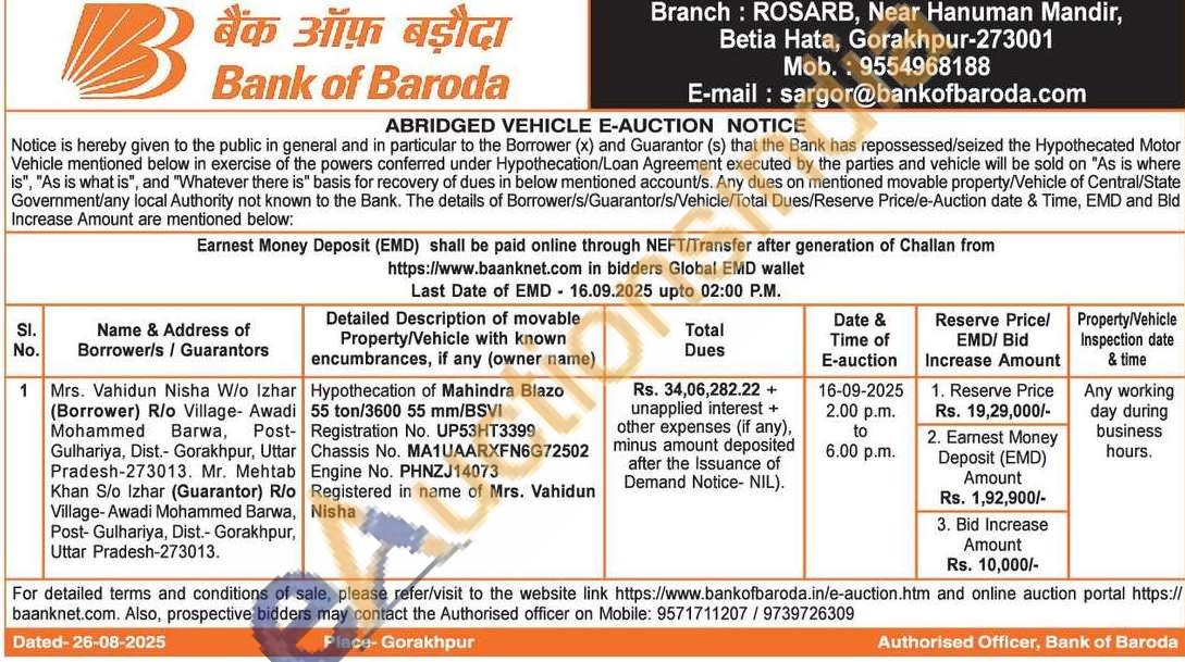 Hypothecation of Mahindra Blazo 55 ton/3600 55 mm/BSVI Registration No. UP53HT3399