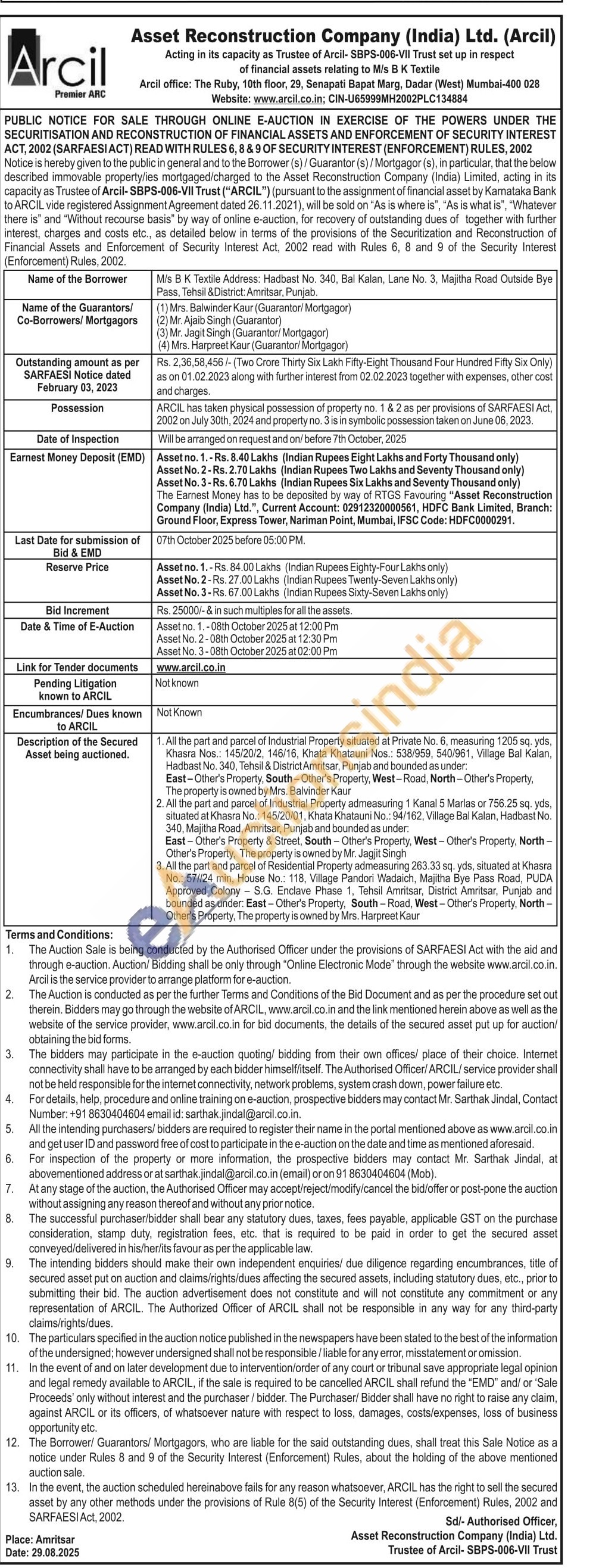 All the part and parcel of Industrial Property admeasuring 1 Kanal 5 Marlas or 756.25 sq. yds, situated at Khasra No.: 145/20/01, Khata Khatauni No.: 94/162, Village Bal Kalan, Hadbast No. 340, Majitha Road, Amritsar, Punjab and bounded as under: East - Other's Property & Street, South - Other's Property, West - Other's Property, North -Other's Property, The property is owned by Mr. Jagjit Singh