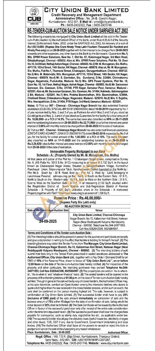 All that piece and parcel of the Plot No. 1 Chakarapani Nagar Annex, comprised in Survey No. 9, (AS Patta No. 3013 S.No. 9/1C) measuring to an extent of 2.132 Sq ft. in the layout known as Chakarapari Nagar Annex. Situated in Gerugambakkam Village, Kundrathur Panchayat Union, Sriperumpudur Taluk, Kancheepuram District bounded on the North by: Plot No.9, South by 30 ft Road, East by Plot No. 2, West by Land belonging to Lakshmana Parumal admeasuring on the North to South on the Eastem Side: 61.9 ft. North to South on the Western side: 62.9 ft. East to West on the Northern Side: 31.6 ft, East to West on the Southom Side 37.0 ft, in all measuring 2,132 Sq ft. siluated within the Registration District of South Madras and Sub-Registration District of Pammal Schedule 8 Property of 524 Sqft undivided share in the Schedule A mentoned Property together with Flat F1 First Floor measuring to an extent of 1,126 Sq. ft.