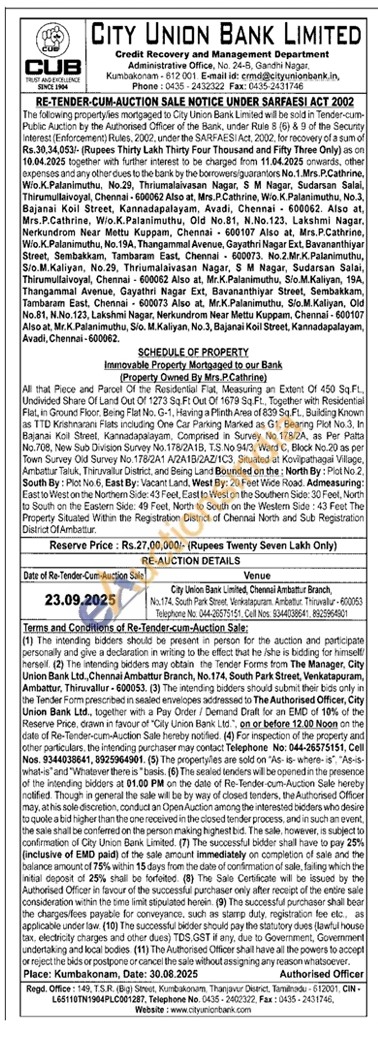All that Plece and Parcel Of the Residential Flat, Measuring an Extent Of 450 Sq Ft Undivided Share Of Land Out Of 1273 Sq Ft Out Of 1679 Sq Ft., Together with Residential Flat, in Ground Floor. Being Flat No. G-1, Having a Plinth Area of 839 Sq.Ft., Building Known as TTD Krishnarani Flats including One Car Parking Marked as G1, Beanng Plot No.3, In Bajanai Koil Street, Kannadapalayam, Comprised in Survey No.178/2A, as Per Patta No.708, New Sub Division Survey No. 178/2A1B, T.S. No 94/3, Ward C, Block No.20 as per Town Survey Old Survey No. 178/2A1 A/2A1B/2AZ/1C3, Situated at Kovilpathagal Vilage, Ambatur Taluk, Thiruvallur District, and Being Land Bounded on the North By: Plot No 2, South By: Plot No.6, East By: Vacant Land, West By: 20 Feet Wide Road. Admeasuring: East to West on the Northem Side: 43 Feet, East to West on the Southern Side: 30 Feet, North to South on the Eastern Side: 49 Feet, North to South on the Westem Side: 43 Feet The Property Situated Within the Registration District of Chennai North and Sub Registration District Of Ambattur