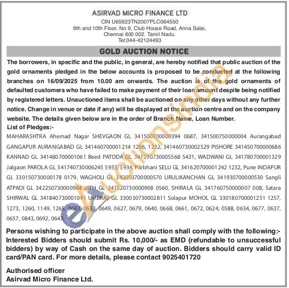 Asirvad Micro Finance Ltd Gold Auctions Auction in Ahmednagar