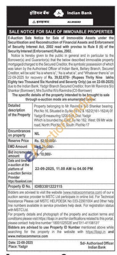 Plot No 16, Situated in Sy. No 161/2 & 162/2(161-162/A) Of Yadgir B measuring 1200 Sqft, Dist: Yadgir Which is bounded by: East: Sy No 162, West: 09 Mtr wide road, North: Plot No 15, South: Plot No 17