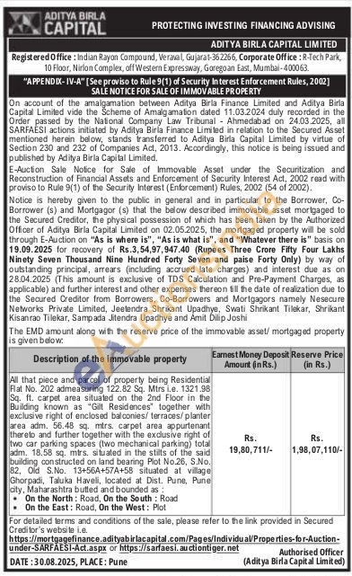 All that piece and parcel of property being Residential Flat No. 202 admeasuring 122.82 Sq. Mirs Mirs ie. 1321.98 Sq. ft. carpet area situated on the 2nd Floor in the Building known as "Gilt Residences" together with exclusive right of enclosed balconies/terraces/planter area adm. 56.48 sq. mtrs. carpet area appurtenant thereto and further together with the exclusive right of two car parkirng spaces (two mechanical parking) total adm. 18.58 sq. mirs, situated in the stilts of the said building constructed on land bearing Plot No.26, S.No. 82, Old S.No. 13+56A+57A+58 situated at village Ghorpadi, Taluka Haveli, located at Dist. Pune, Pune city, Maharashtra butted and bounded as: