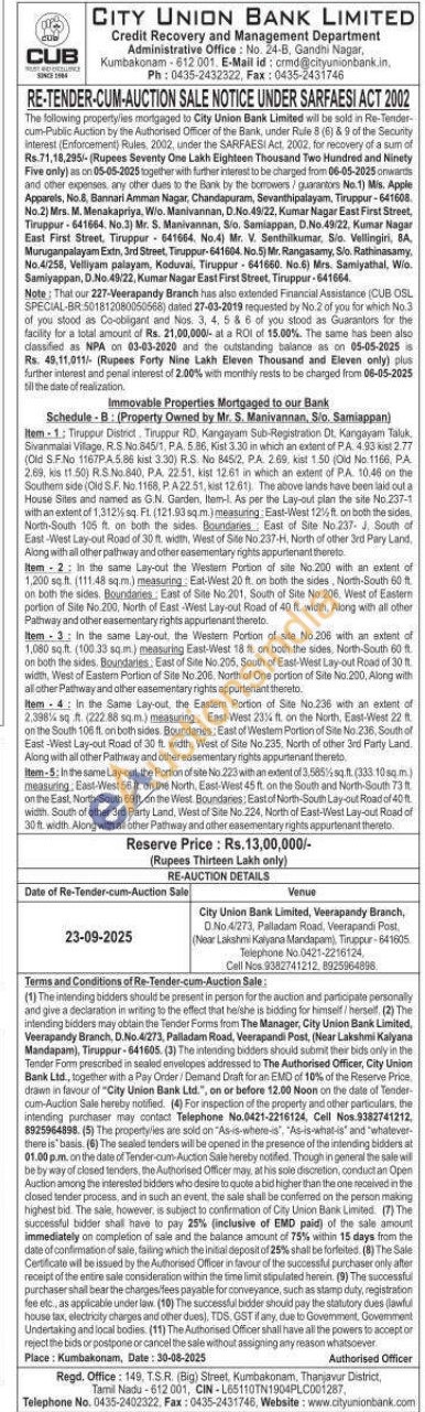 Item-1: Tiruppur District, Tiruppur RD, Kangayam Sub-Registration Dt. Kangayam Taluk Sivanmalai Village, R.S.No.845/1, P.A. 5.86, Kist 3.30 in which an extent of P.A. 4.93 kist 2.77 (Old S.F.No 1167PA.5.86 kist 3.30) R.S. No 845/2, P.A. 269, kist 1.50 (Old No. 1166, PA 2.69, kis 11.50) R.S.No.840, PA. 22.51, kist 12.61 in which an extent of P.A. 10.46 on the Southern side (Old S.F. No. 1168, P.A22.51, kist 12.61). The above lands have been laid out a House Sites and named as G.N. Garden, Item-l. As per the Lay-out plan the site No.237-1 with an extent of 1,3125 sq. Ft. (121.93 sq.m.) measuring: East-West 12 1/2 ft. on both the sides, North-South 105 ft. on both the sides. Boundaries East of Site No.237- J, South of East-West Lay-out Road of 30 ft. width, West of Site No 237-H, North of other 3rd Pary Land, Along with all other pathway and other easementary rights appurtenant thereto