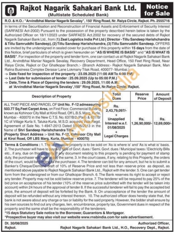 ALL THAT PIECE AND PARCEL OF Unit No. F-12 admeasuring 503.77 Sq. Feet Carpet Area, on First Floor, Commercial Building known as Kohinoor City Mall at Kirol Road, Off L.B.S. Marg, Kurla, Mumbai-400070 in the New C.T.S. No. 637/B/2 (Part) & 637/B/1C of Village Kurla II, Taluka-Kurla, M.S.D. acquired Vide Regd. Agreement of Sale No. 1-4947-2013 Dated 03/06/2013 in the Name of Shri Sandeep Harishchandra Tillu. (Property Short Address: Unit No. F-12, Kohinoor City Mall at Kirol Road, Off LBS Marg, Kurla, Mumbai-400070)