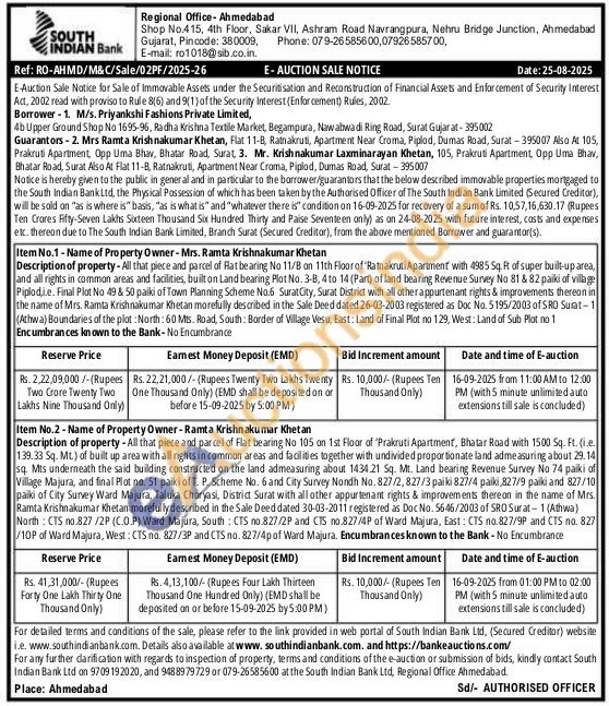 Description of property-All that piece and parcel of flat bearing No 105 on 1st Floor of "Prakruti Apartment, Bhatar Road with 1500 Sq. Ft. (i.e. 139.33 Sq. Mt.) of built up area with all rights in common areas and facilities together with undivided proportionate land admeasuring about 29.14 5q. Mts underneath the said building constructed on the land admeasuring about 1434.21 Sq. Mt. Land bearing Revenue Survey No 74 paiki of Village Majura, and final Plot no. 51 paiki ofT. P. Scheme No. 6 and City Survey Nandh No. 827/2, 827/3 paiki 827/4 paiki 827/9 pailiki and 827/10 paiki of City Survey Ward Majura, Taluka Choryasi, District Surat with all other appurtenant rights & improvements thereon in the name of Mrs. Ramta Krishnakumar Khetan morefully described in the Sale Deed dated 30-03-2011 registered as Doc No. 5646/2003 of SRO Surat-1 (Athwa) North: CTS no.827/2P (C.O.P) Ward Majura, South CTS no.827/2P and CTS no.827/4P of Ward Majura, East: CTS no.827/9P and CTS no. 827 /10P of Ward Majura, West: CTS no. 827/3P and CTS no. 827/4p of Ward Majura. Encumbrances known to the Bank-No Encumbrance