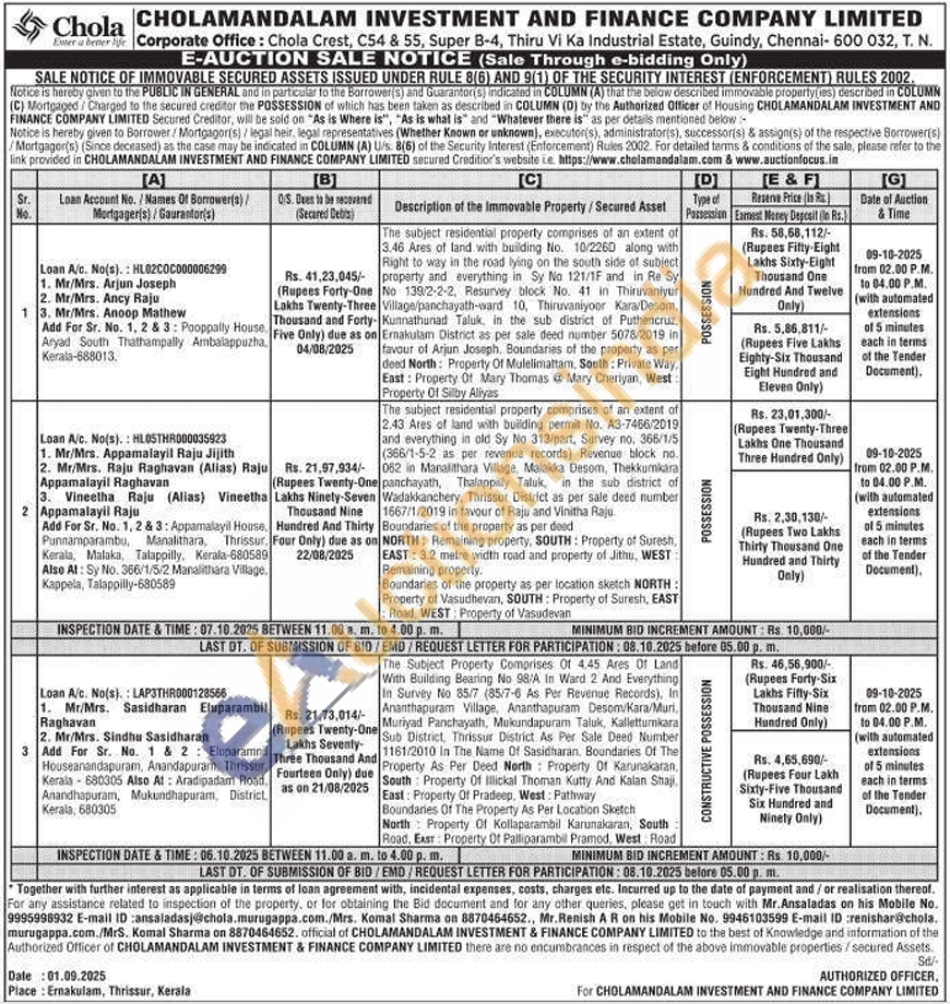 The subject residential property comprises of an extent of 3.46 Ares of land with building No. 10/2260 along with Right to way in the road lying on the south side of subject property and everything in Sy No 121/1F and in Re Sy No 139/2-2-2, Resurvey block No. 41 in Thiruvaniyur Village/panchayath-ward 10, Thiruvaniyoor Kara/Desom, Forty-Kunnathunad Taluk, in the sub district of Puthencruz, Ernakulam District as per sale deed number 5078/2019 in favour of Arjun Joseph. Boundaries of the property as per deed North: Property Of Mulelimattan, South: Private Way. East: Property Of Mary Thomas Mary Cheriyan, West: Property Of Silby Aliyas