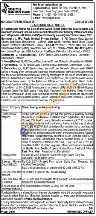 All that part and parcel of ground floor portion of property bearing Municipal no. 20 (New No. 23/18 and now 23/2) (Old No. 14, Laxman Chowk), P.D. Tandon Marg, Dehradun admeasuring 477 35 Sq. Mtrs. along with residential building thereon having a total area of about 532.70 Sq. Mt (5514 Sq ft considered for valuation being permissible BUA) along with all other constructions, improvements, easementary rights existing and appurtenant thereon and owried by Neeraj Rastogi and Anjana Rastogi morefully described in Gilt Deed no 2858/2016 dated 19-03-2016, Gift Deed no 2856/2016 dated 19-03-2016, Sale Deed no 6379/2003 dated 08-10-2003, Sale Deed no 212/2001 dated 09-01-2001 all of Sub Registrar Office-Dehradun and bounded on North: Road South: Property of Vijay Kumar Rastogi & Others East: Road West: Property of Mr. Kamal Mittal