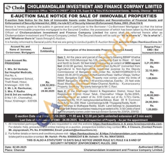 Item 2. In the Krishnagiri District & Registration District, Hosur Sub Registration District Hosur Taluk, Chennathur Village Sy.No. 209/5, admeasuring to an extent of Ac. 0.50 Cents out of Ac. 5.72% Cents, Assessment Rs. 10.31, being bounded as follows. East: 30 ft Common Road & Sy No. 208, West Land belongs to Mr. Thiyagaraj Reddy, North Land belongs to Muthappa Reddy, South: Land belongs to Jayasankara Reddy, with these boundaries measuring an extent of Ac. 0.50 Cents of land and the property comes under new sub division Survey No 209/5A, 209/50