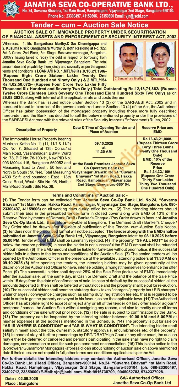 Contact (ph. 080-23300497, 23402712, 23359600) E-Mail: vjn@jscbl.com. Mob:9916738709, 9945052783, 9742327028