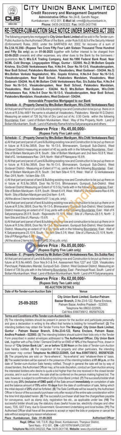 2) a) All that part and parcel of Land & Building existing now and Construction to be put up there on in future at R.S.No.385/8, Door No 16-13-5, Bhimavaram, Gunipudi Sub-District, West Godavari District measuring an extent of 40 sq yards with in the following Boundares. East Site of Bollam Manikyam-24 ft. South: Site of Bollam Manikyam and 2nd Item-16.8 ft, West: Wall of G. Venkateswara Rao-24 ft, North: Wall of P.Narayana-16.8 ft b) All that part and parcel of Land & Building existing now and Construction to be put up there on in future at R.S.No. 385/8, Door No.16-13-5. Bhimavaram, Gunipud Sub-District, West Godavari District-Measuring an Extent of 11 sq yards with in the following Boundaries: East Site of Bollam Manikyam-20, South: 3rd Item Site-4.10 ft. West Wall of G. Venkateswara Rao-24 ft, North Ist item Site-5ft c) All that part and parcel of land & Building existing now and Construction to be put up there on in future at R.S.No. 385/8, Door No.16-13-5, Bhimavaram, Gunipudi Sub-District. West Godavari District Measuring an Extent of 10.5 Sq. Yards with in the following Boundaries. East Site of Bollam Manikyam-6.8 ft, South: Street-6.4ft, West. Wall of G 'Venkateswara Rao-6.8ft North: Site of Bollam Manikyam and 2nd Item-6.4 (All the above 3 items total extentia 6116 sq yds only). a) All that part and parcel of land & building existing now and construction to be put up there on in future at R.S.No.385/8, Door No. 16-13-5, Bhimavaram, Gunipudi Sub-District, West Godavan District measuring an extent of 47.9 sq yards with in the following Boundaries. East: Wall of K Satyanarayana-26.8 ft. South: Rajaveedhi-15.10 ft. West Site of J Ramulu-28.5 ft. North: 2 Item Site and Site of Ramulu-15.611. b) All that part and parcel of land & building existing now and construction to be put up there on in future at R.S.No. 385/8, Door No. 16-13-5. Bhimavaram, Gunipudi Sub-District, West Godavar District. Measuring an extent of 14.4 Sq. Yards with in the following Boundaries: East: Wall of K Satyanarayana-23.10 ft, South 1st item Site-5.3 ft. West: Site of J.Ramulu-23 10 ft. North: Site of P. Ranga Rao-5.8tt (All the above 2 items total extent is 62.30 sq yds, only).