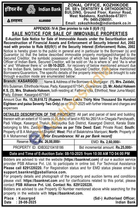 All part and parcel of land and building thereon with an extent of 10 cents (4.05 Ares) of land in RS No 260/1A in Chegala Panchayath, Padi Village, Kasargod Thaluk, Badiaydka Sub District, Kasargod Distrcit, Kerala State belonging to Mrs. Zaidabi. Boundaries as per Title Deed: East: Private Road; South: Property of B A Mohammed Shereef; West: Plot of Balakrishna Maniyani; North: Property of B A Mohammed Shereef. [Prior Encumbrance: Nil as per Bank record]