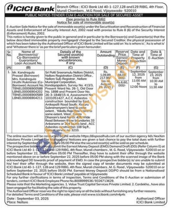 Sri Potti Sreeramulu Nellore District, Nellore Registration District Office, Nellore Sub-Registrar, Nellore Municipal Corporation, Kandayapalem, Survey No. 413/3, Present Ward No. 26-1. Old Door No. 1898 and Present Door No. 26-3-1848/15-4, Assessment No. 1031051427, A.C.C Asbestos construction bounded by East: Anikepalli Road South: Kosuru Subramanyam's land to some extent, Yekollu Raja Rao's land to some extent. West: Ganta Dhanam's land North: 40ft Wide Road Between these boundaries 33 Ankanams or 264 Sq.Yds land, ACC Asbestos construction 108 Sq.ft. Current service no. 3210