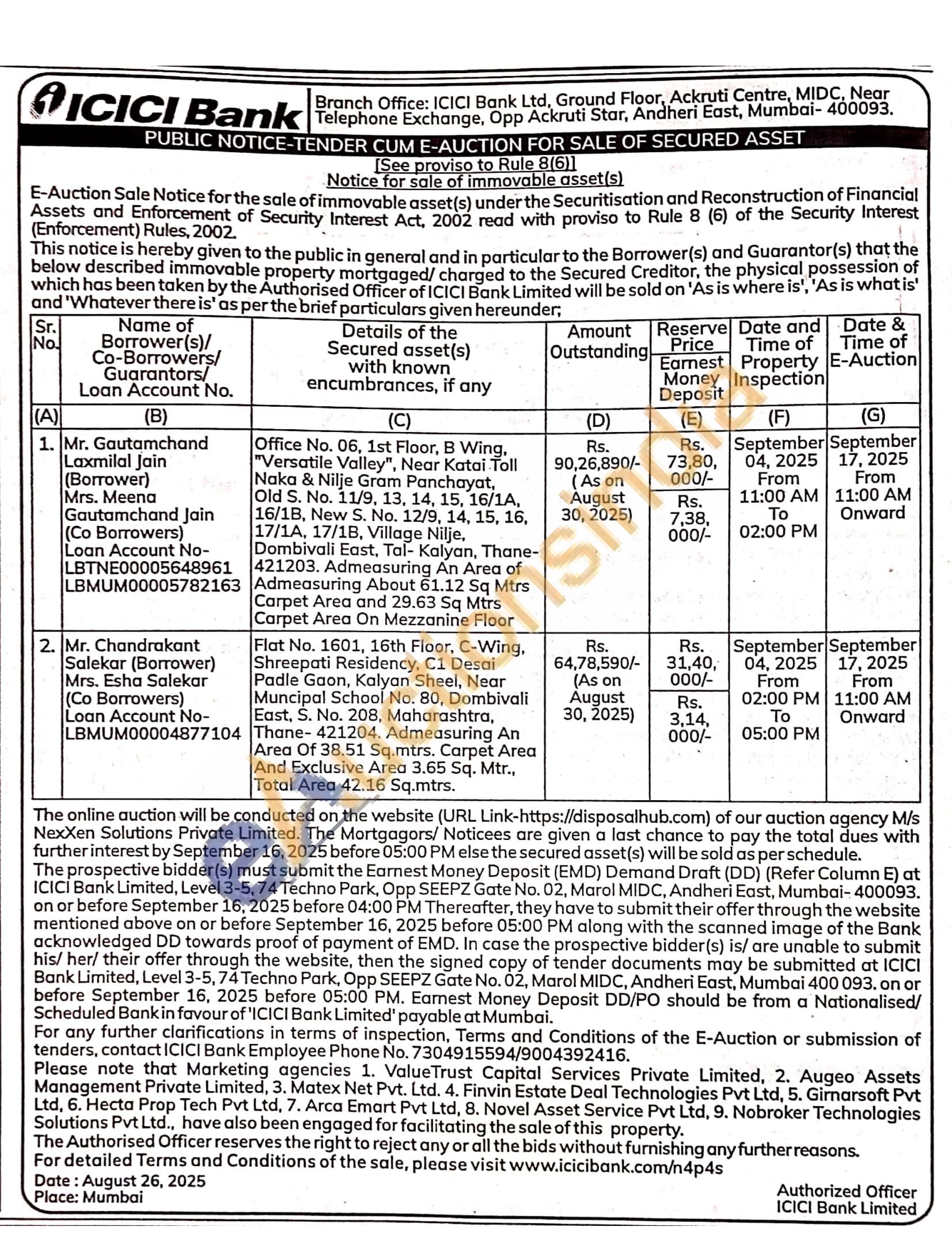 Flat No. 1601, 16th Floor, C-Wing. Shreepati Residency, C1 Desai Padle Gaon, Kalyan Sheel, Near Muncipal School No. 80, Dombivali East, S. No. 208, Maharashtra, Thane-421204. Admeasuring An Area Of 38.51 Sq.mtrs. Carpet Area And Exclusive Area 3.65 Sq. Mtr., Total Area 42.16 Sq.mtrs