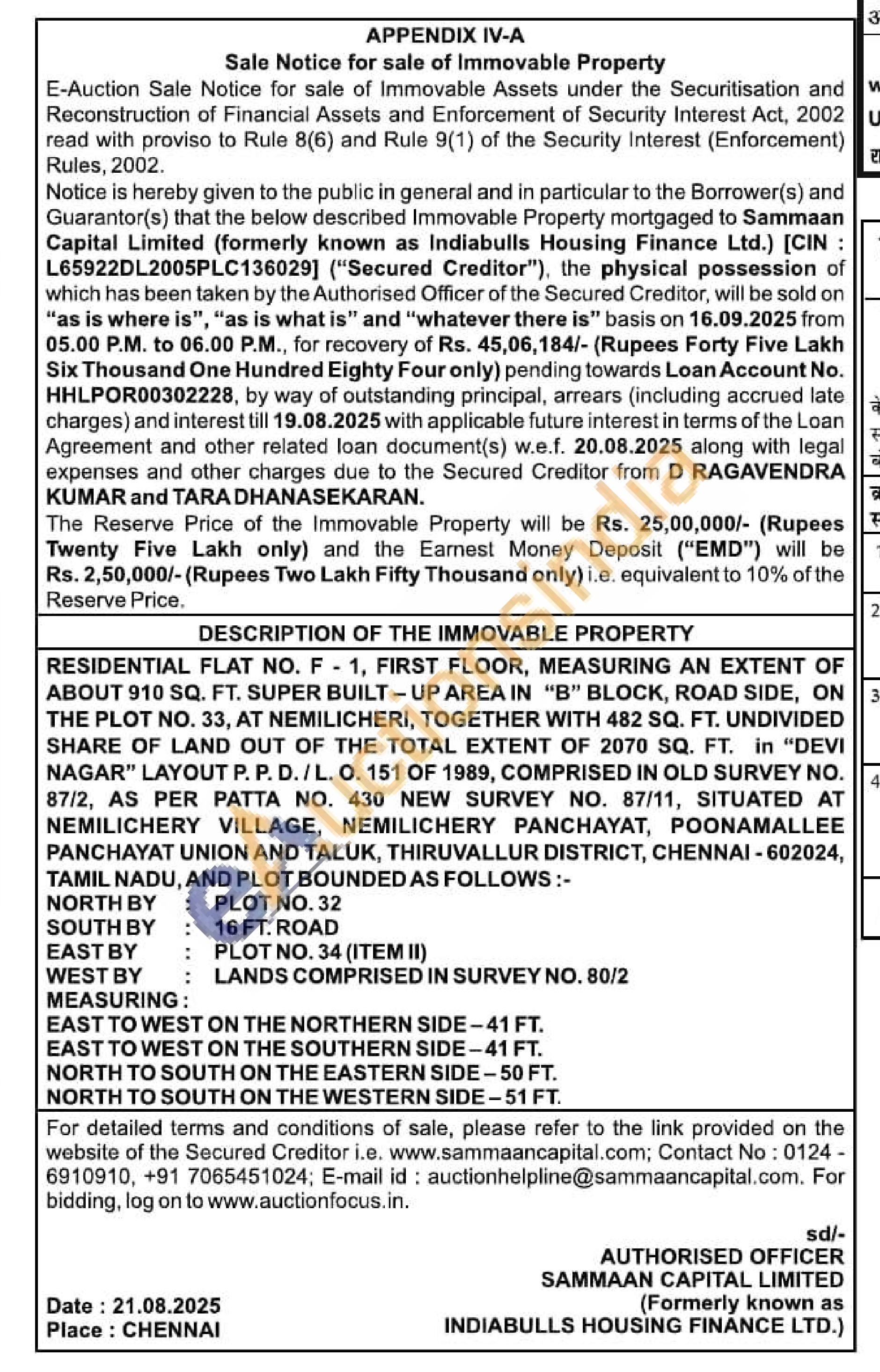 RESIDENTIAL FLAT NO. F1, FIRST FLOOR, MEASURING AN EXTENT OF ABOUT 910 SQ. FT. SUPER BUILT-UP AREA IN "B" BLOCK, ROAD SIDE, ON 3 THE PLOT NO. 33, AT NEMILICHERI, TOGETHER WITH 482 SQ. FT. UNDIVIDED SHARE OF LAND OUT OF THE TOTAL EXTENT OF 2070 SQ. FT. in "DEVI NAGAR" LAYOUT P. P. D./L. O. 151 OF 1989, COMPRISED IN OLD SURVEY NO. 4 87/2, AS PER PATTA NO. 430 NEW SURVEY NO. 87/11, SITUATED AT NEMILICHERY VILLAGE, NEMILICHERY PANCHAYAT, POONAMALLEE PANCHAYAT UNION AND TALUK, THIRUVALLUR DISTRICT, CHENNAI-602024, TAMIL NADU, AND PLOT BOUNDED AS FOLLOWS :- NORTH BY : PLOT NO. 32 SOUTH BY : 16 FT. ROAD EAST BY : PLOT NO. 34 (ITEM II) WEST BY : LANDS COMPRISED IN SURVEY NO. 80/2 MEASURING: EAST TO WEST ON THE NORTHERN SIDE-41 FT. EAST TO WEST ON THE SOUTHERN SIDE-41 FT. NORTH TO SOUTH ON THE EASTERN SIDE-50 FT. NORTH TO SOUTH ON THE WESTERN SIDE-51 FT.