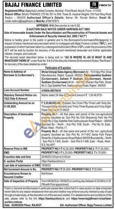 Property No.2-All that piece and parcel of the non-agricultural property discribed as: Sub Plot No. 6+7+8/C Sarita Park Param Street No.3 Sadhuvasvani Road Rajkot 360005 Bounded By-North Sub Plot 6-7-8/D, South-Sub Plot 6-7-8/B, East: Road, West: R.S. No.46 P