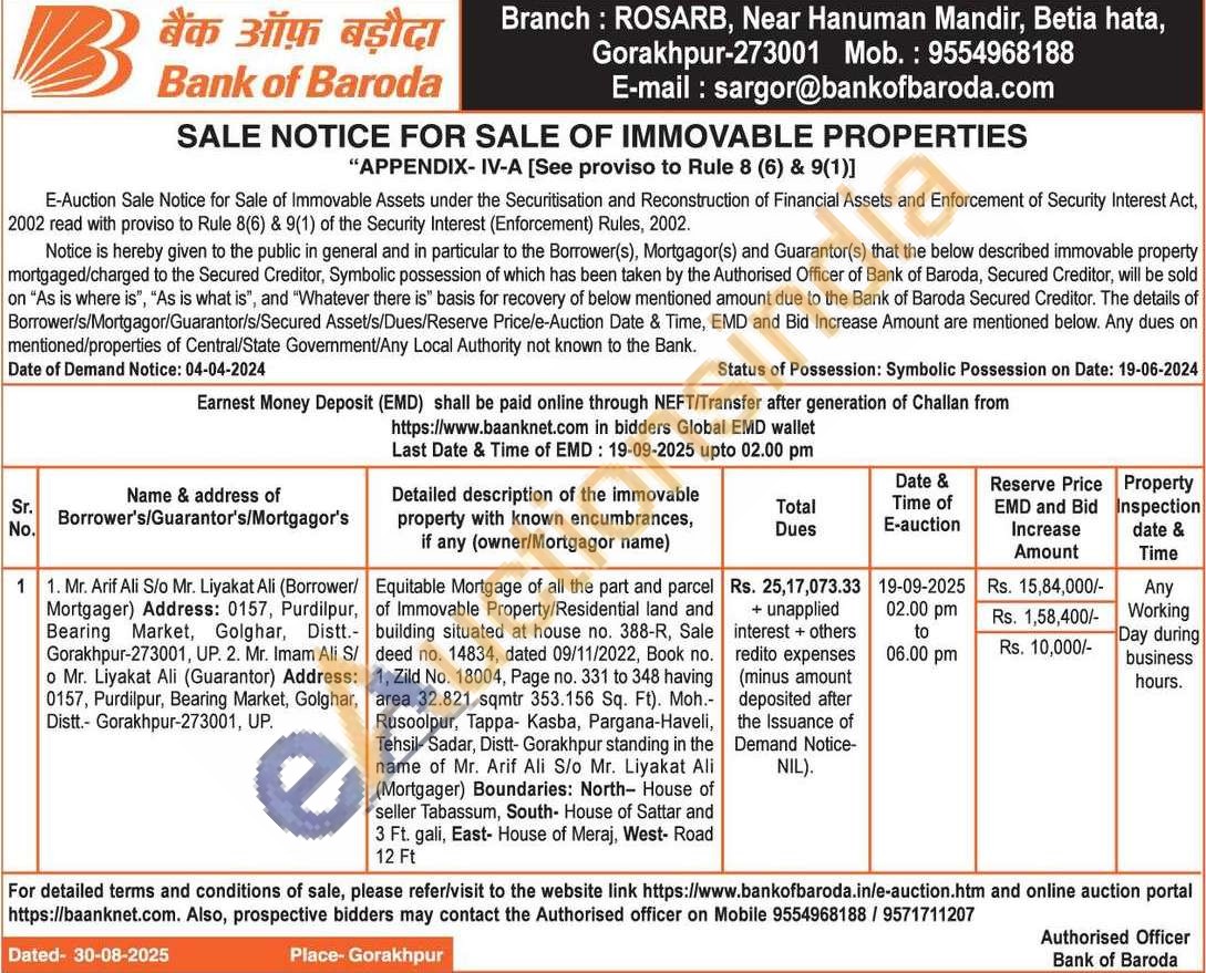 Equitable Mortgage of all the part and parcel of Immovable Property/Residential land and building situated at house no. 388-R, Sale deed no. 14834, dated 09/11/2022, Book no. 1, Zild No. 18004, Page no. 331 to 348 having area 32.821 sqmtr 353.156 Sq. Ft). Moh. Rusoolpur, Tappa- Kasba, Pargana-Haveli, Tehsil- Sadar, Distt- Gorakhpur standing in the name of Mr. Arif Ali S/o Mr. Liyakat Ali (Mortgager) Boundaries: North- House of seller Tabassum, South- House of Sattar and 3 Ft. gali, East- House of Meraj, West- Road 12 Ft