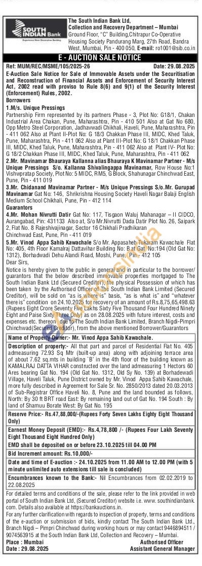 All that part and parcel of Residential Flat No. 405 admeasuring 72.93 Sq Mtr (built-up area) along with adjoining terrace area of about 7.62 sq.mts in building 'B' in the 4th floor of the building known as KAMALRAJ DATTA VIHAR constructed over the land admeasuring 1 Hectors 60 Ares bearing Gat No. 194 (Old Gat No. 1312, Old Sy No. 139) at Borhadewadi Village, Haveli Taluk, Pune District owned by Mr. Vinod Appa Sahib Kawachale, more fully described in Agreement for Sale Sr. No. 2850/2013 dated 20.03.2013 of Sub-Registrar Office Haveli No. 8, Pune and the land bounded as follows, North: By 30 ft BRT road East: By remaining land out of Gat No. 194 South: By land of Shamuu Borate West: By Gat No. 195