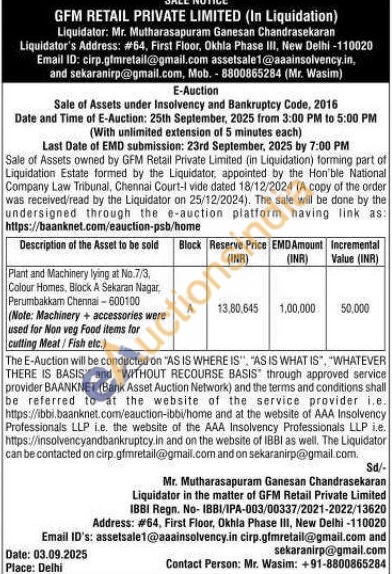 Plant and Machinery lying at No.7/3, Colour Homes, Block A Sekaran Nagar, Perumbakkam Chennai-600100