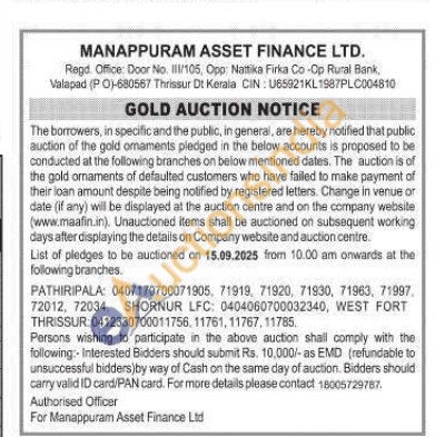 Manappuram Asset Finance Ltd Gold Auctions Auction in Thrissur