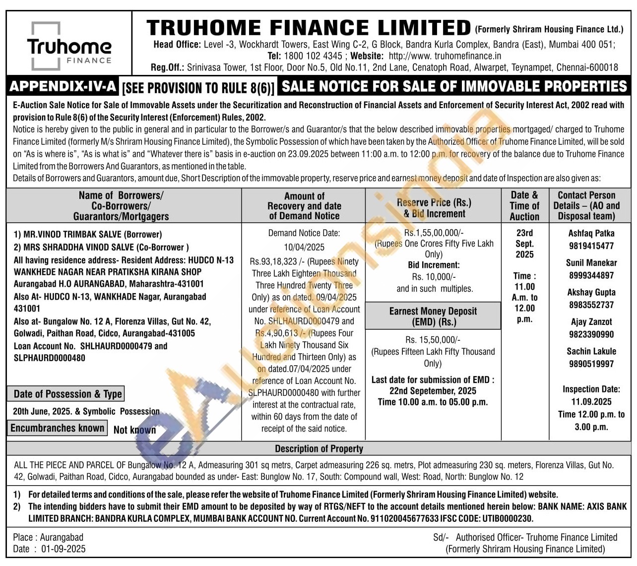 ALL THE PIECE AND PARCEL OF Bungalow No. 12 A, Admeasuring 301 sq metrs, Carpet admeasuring 226 sq. metrs, Plot admeasuring 230 sq. meters, Florenza Villas, Gut No. 42, Golwadi, Paithan Road, Cidco, Aurangabad bounded as under- East: Bunglow No. 17, South: Compound wall, West: Road, North: Bunglow No. 12