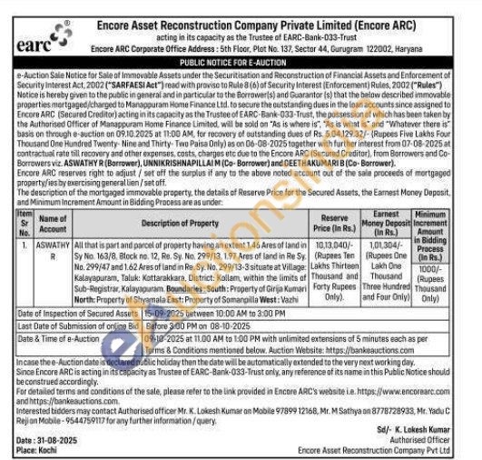 All that is part and parcel of property having an extent 1.46 Ares of land in Sy No. 163/8, Block no. 12, Re. Sy No. 299/13, 1.97 Ares of land in Re Sy. No. 299/47 and 1.62 Ares of land in Re. Sy. No. 299/13-3 situate at Village: Kalayapuram, Taluk: Kottarakkara, District: Kollam, within the limits of Sub-Registrar, Kalayapuram. Boundaries: South: Property of Girija Kumari North: Property of Shyamala East: Property of Somangilla West: Vazhi 10,13,040/-(Rupees Ten Lakhs Thirteen Thousand and Forty Rupees Only) 1,01.304/-Rupees One Lakh One Thousand Three Hundred and Four Only) Thousand Only) 1000/-(Rupees Date of Inspection of Secured Assets 15-09-2025 between 10:00 AM to 3:00 PM