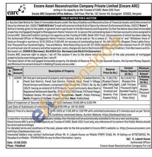 All that part and parcel of property and improvements in Palakkad District. Parali Sub District, Parali Sub District, Palkkad Taluk, Parali Village. Parali Amsom and Desem, comprised in Old Survey No. 2700/1, Re. Sy. No. 245/9, having an extend of 0.0113 Hector, more particularly described in Registered Settlement Deed No. 3726 of 2012 SRD Parali, PO Parali Palgat Palakkad, Kerala, Pin code: 678612. Boundaries: South: Public Pathway North: Property of Vi East: Property of Ravi. West: Publio Read