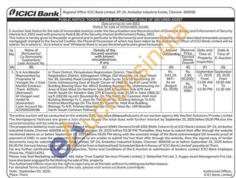 In Theni District, Periyakulam Registration District. Theni Sub Registration District, Allinagaram Village, Old Ward No: 19, New Ward No: 30, Gandhiji Rood Comprised in Ayan Sy.no: 514/18 Measuring 20 Cents Admeasuring East of South Corner of 1966.25 Sq.ft of Land With Building Bearing Door No: 49A/2 Building Bounded By. (Admeasuring An Area of East-West On Northern Side 63ft & Southern Side 67ft And North-South On Western Side 27ft & Eastern Side 33.5ft in Total 1966.25 sq.ft (182.66 sq.mtr) Bounded By: On The North By: Common Wall And Building Belongs To C. Jeya On The South By: Building Belongs To N.R. Krishna Moorthyraja On The East By: Common Wall And Building Belongs To N.R. Krishna Moorthyraja On The West By: 16ft Breadth North-South Common Pathway