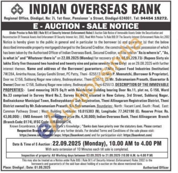 Land meauring 3675 Sq.ft with Residential building bearing Door No.11, plot no, C-156, Ward No.33 comprised in Survey Ward No.2. Survey No.4430 situated in New Colony, 3rd Street, Subburaj Nagar, Bodinaickanur Municipal Town, Bodinayakkanur Sub Registration, Theni Allinagaram Registration District, Theni District
