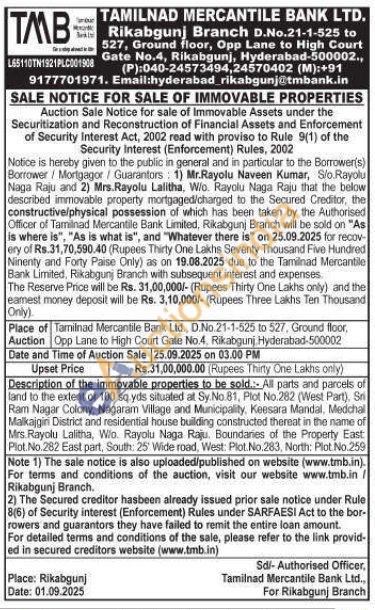 All parts and parcels of land to the extent of 100 sq yds situated at Sy.No. 81, Plot No.282 (West Part), Sri Ram Nagar Colony, Nagaram Village and Municipality, Keesara Mandal, Medchal Malkajgin District and residential house building constructed thereat in the name of Mrs. Rayolu Lalitha, Wlo. Rayolu Naga Raju Boundaries of the Property East Plot. No.282 East part, South: 25' Wide road, West: Plot. No. 283. North: Plot. No.259
