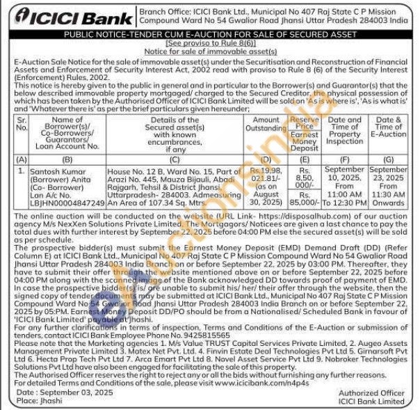 House No. 12 B, Ward No. 15, Part of Arazi No. 445, Mauza Bijauli, Abadi Rajgarh. Tehsil & District Jhansi, Uttarpradesh-284003. Admeasuring An Area of 107.34 Sq. Mtrs.