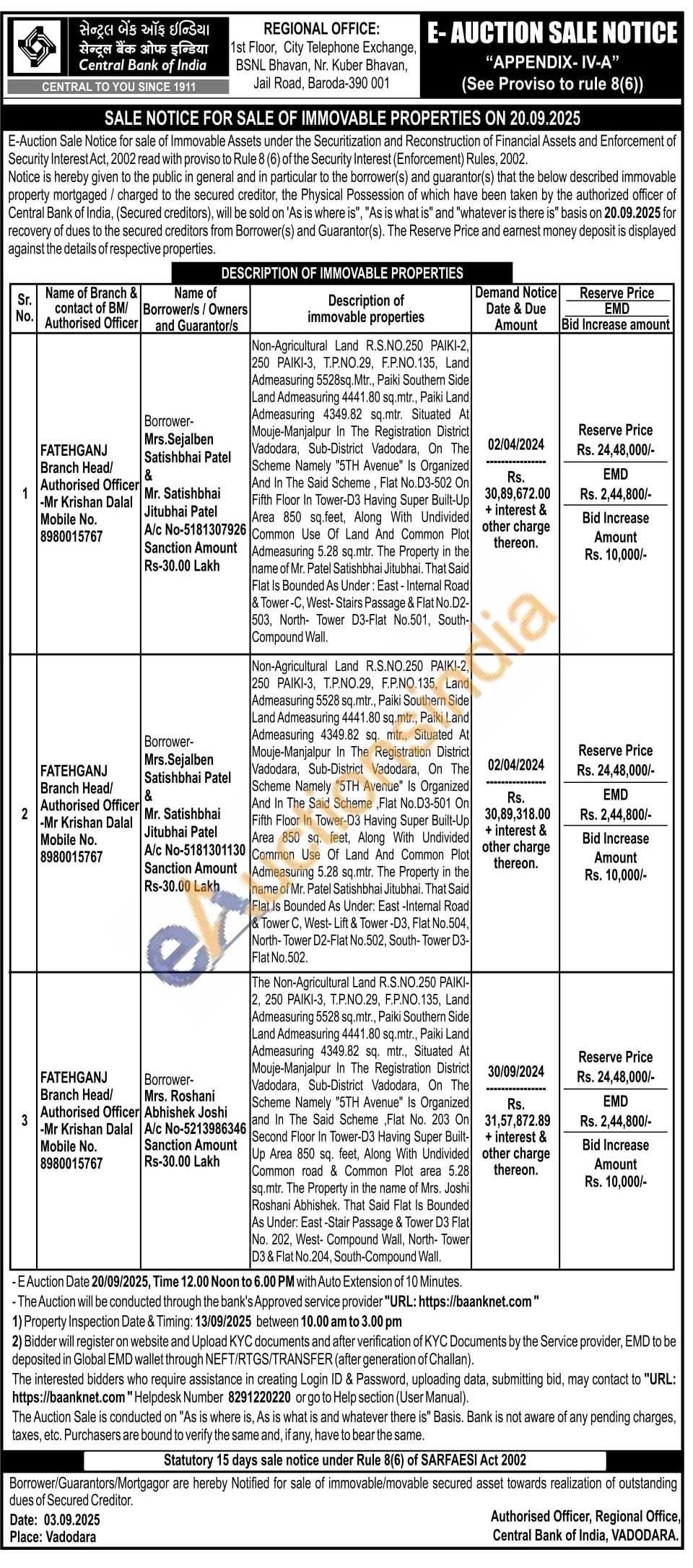 Non-Agricultural Land R.S NO.250 PAIKI-2 1250 ΡΑΙΚΙΟ ΤΡΙΝΟ 29. FPNO. 135. Land Admessung 5528 sq.mtr., Paiki Southem Side Land Admeasuring 4441.80 sq mir, Paiki Land Admeasuring 4349.82 sq. mér, Situated At Mouje-Manjalpur In The Registration District Vadodara, Sub-District Vadodara, On The Schome Namely 5TH Avenue" is Organized And In The Said Scheme Flat No.03-501 On Fith Floor In Tower-D3 Having Super Built-Up Area 850 sq. feet, Along With Undivided Common Lise Of Land And Common Pict Admeasuring 5.28 sq.mir, The Property in the name of Mr. Patel Salishbhai Jilubhai. That Said Flat Is Bounded As Under: East-Intemal Road & Tower C. West-Lift & Tower-D3. Flat No.504 North-Tower D2-Fist No 502 South-Tower 03-Flat No.502