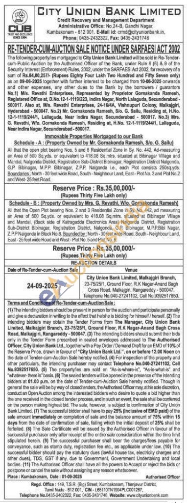 Schedule-B: All that the Open Plot bearing Nos. 2 and 3 Residential Zone in Sy. No. 442, ad measuring an Area of 500 Sq yds, or equivalent to 418.05 Sqmes. situated at Bibinagar Vilage and Mandal, (Back side of Katragadda Electronics Area) Nalgonda District, Registration Sub-District Bibinagar, Registration District, Nalgonds, G.P. Bibinagar, M.PP.Bibi Nagar, ZPP Nalgonds in Block No 8. Bounded by: North-30 feet wide Road, South-Neighbour Land, East-25 feet wide Road and West-Plot No. 5 and Plot No. 8.