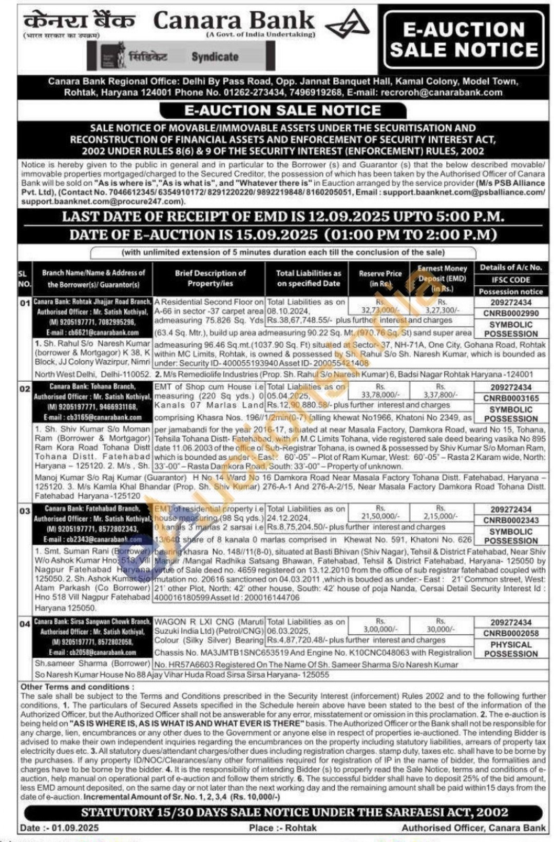Contact Sirsa Sangwas Chowk Branch Authorised Officer: Mr. Satish Kathiyal, $205197771, 8572802858