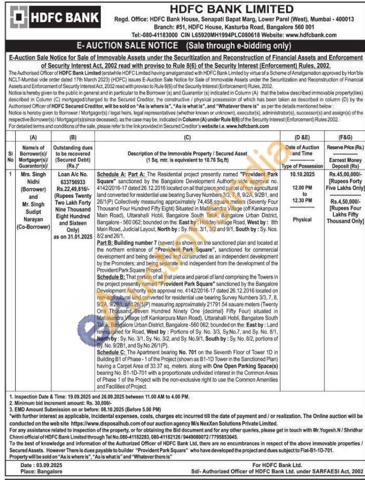 Schedule A: Part A: The Residential project presently named "Provident Park Square" sanctioned by the Bangalore Development Authority vide approval no. 4142/2016-17 dated 26.12.2016 located on all that piece and parcel of non agricultural land converted for residential use bearing Survey Numbers 3/3, 7, 8, 9/2A, 9/281, and 26/1(P) Collectively measuring approximately 74,458 square meters (Seventy Four Thousand Four Hundred Fifty Eight) Situated in Mallasandra Village (off Kankanpura Main Road), Uttarahalli Hobli, Bangalore South Taluk, Bangalore Urban District, Bangalore-560062; bounded on the: East by: Holiday Village Road, West by: 8th Main Road, Judicial Layout, North by: Sy. Nos. 3/1, 3/2 and 9/1, South by: Sy. Nos. 8/2 and 26/1.