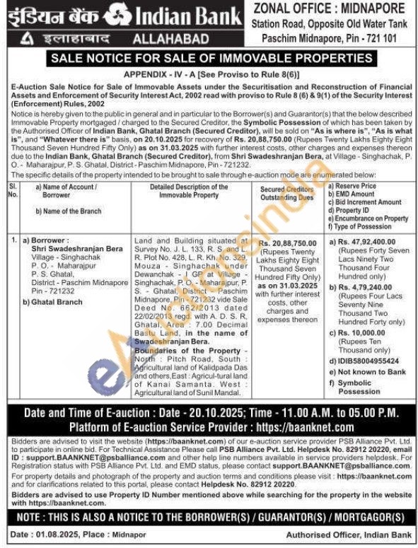 Land and Building situated at Survey No. J. L. 133. R. S and L R. Plot No. 428, L. R. Kh. No. 329. Mouza Singhachak under Dewanchak I GP at Village Singhachak, P. O. - Maharajpur, P S. Ghatal, District Paschim Midnapore, Pin-721232 vide Sale Deed No. 662/2013 dated 22/02/2013 regd. with A. D. S. R Ghatal, Area 7.00 Decimal Bastu Land, in the name of Swadeshranjan Bera.
