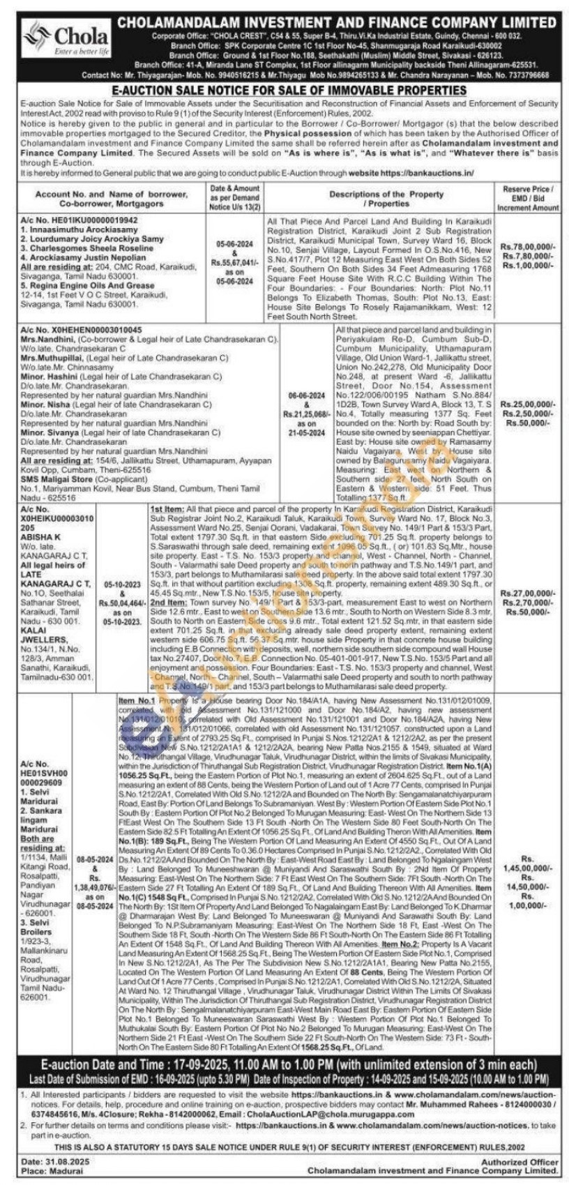 4) Item No.1 Property is a House bearing Door No 184/A1A, having New Assessment No.131/01201009, correlated with old Assessment No.131/121000 and Door No.184/A2, having new assessment No. 131/012/01010, correlated with Old Assessment No. 131/121001 and Door No.184/A2A, having New Assessment No. 131/012/01066, correlated with old Assessment No. 131/121057. constructed upon a Land measuring an Extent of 2793.25 Sq Ft, comprised in Punjai S. Nos. 1212/2A1 & 1212/2A2, as per the present Subdivision New S.No. 1212/2A1A1 & 12122A2A, bearing New Palta Nos 2155 & 1549, situated at Ward No. 12. Thiruthangal Village, Virudhunagar Taluk, Virudhunagar District, within the limits of Sivakasi Municipality, within the Jurisdiction of Thiruthangal Sub Registration District, Virudhunagar Registration District. Item No.1(A) 1056.25 Sq. Ft, being the Eastern Portion of Plot No. 1, measuring an extent of 2604.625 Sq.Ft., out of a Land measuring an extent of 88 Cents, being the Western Portion of Land out of 1 Acre 77 Cents, comprised in Punjai S.No 1212/2A1, Correlated With Old S.No. 1212/2A and Bounded on The North By Sengamalanatchiyarpuram Road, East By: Portion Of Land Belongs To Subramaniyan. West By: Western Portion Of Eastern Side Plot No.1 South By: Eastem Portion Of Plot No. 2 Belonged To Murugan Measuring East-West On The Northern Side 13 FrEast West On The Southem Side 13 Ft South -North On The Western Side 80 Feet South-North On The Eastem Side 82.5 Ft Totalling An Extent Of 1056 25 Sq Ft. Of Land And Building Theron With All Amenities Item No.1(B): 189 Sq. Ft, Being The Westem Portion Of Land Measuring An Extent Of 4550 Sq Ft, Out Of A Land Measuring An Extent Of 89 Cents To 0.36.0 Hectares Comprised In Punjai S.No. 1212/242, Correlated With Old Ds.No. 1212/2AAnd Bounded On The North By: East-West Road East By: Land Belonged To Ngalaingam West By: Land Belonged To Muneeshwaran Muniyandi And Saraswathi South By: 2Nd Item Of Property Measuring East-West On The Northem Side: 7 Ft East West On The Southerm Side: 7Ft South-North On The -Eastern Side 27 Ft Totalling An Exdent Of 189 Sq. Ft., Of Land And Building Thereon With All Amenities. Item No.1(C) 1548 Sq Ft, Comprised In Punjai S.No. 1212/2A2, Correlated With Old S.No. 1212/2A And Bounded On The North By: 1St Item Of Property And Land Belonged To Nagalaingam East By: Land Belonged To K. Dharmar Dharmarajan West By: Land Belonged To Muneeswaran Muniyandi And Sarawathi South By: Land Belonged To N.PSubramaniyam Measuring: East-West On The Northerm Side 18 Ft. East -West On The Southern Side 18 Ft. South-North On The Westen Side 86 Ft South-North On The Eastern Side 86 Ft Totalling An Extent Of 1548 Sq. Ft. Of Land And Building Thereon With All Amenities Item No.2: Property Is A Vacarit Land Measuring An Extent Of 1568.25 Sq.Ft., Being The Western Portion Of Eastern Side Plot No.1, Comprised In New S.No. 1212/2A1, As The Per The Subdivision New S.No. 1212/2A1A1, Bearing New Patta No.2155, Located On The Western Portion Of Land Measuring An Extent Of 88 Cents, Being The Westem Portion Of Land Out Of 1 Acre 77 Cents, Comprised in Punjai S.No 1212/2A1, Comelated With Old S. No. 1212/2A, Situated At Ward No. 12 Thiruthangal Village, Virudhunagar Taluk, Virudhunagar District Within The Limits Of Sivakasi Municipality, Within The Jurisdiction Of Thiruthangal Sub Registration District, Virudhunagar Registration District On The North By: Sengalmalanatchiyarpuram East-West Main Road East By: Eastem Portion Of Eastem Side Plot No.1 Belonged To Muneeswaran Saraswathi West By: Westem Portion Of Plot No.1 Belonged To Muthukalai South By: Eastern Portion Of Plot No No.2 Belonged To Murugan Measuring: East-West On The Northern Side 21 Ft East-West On The Southem Side 22 Ft South-North On The Westem Side: 73 Ft-South-North On The Eastern Side 80 Ft Totalling An Extent Of 1568.25 Sq. Ft, Of Land