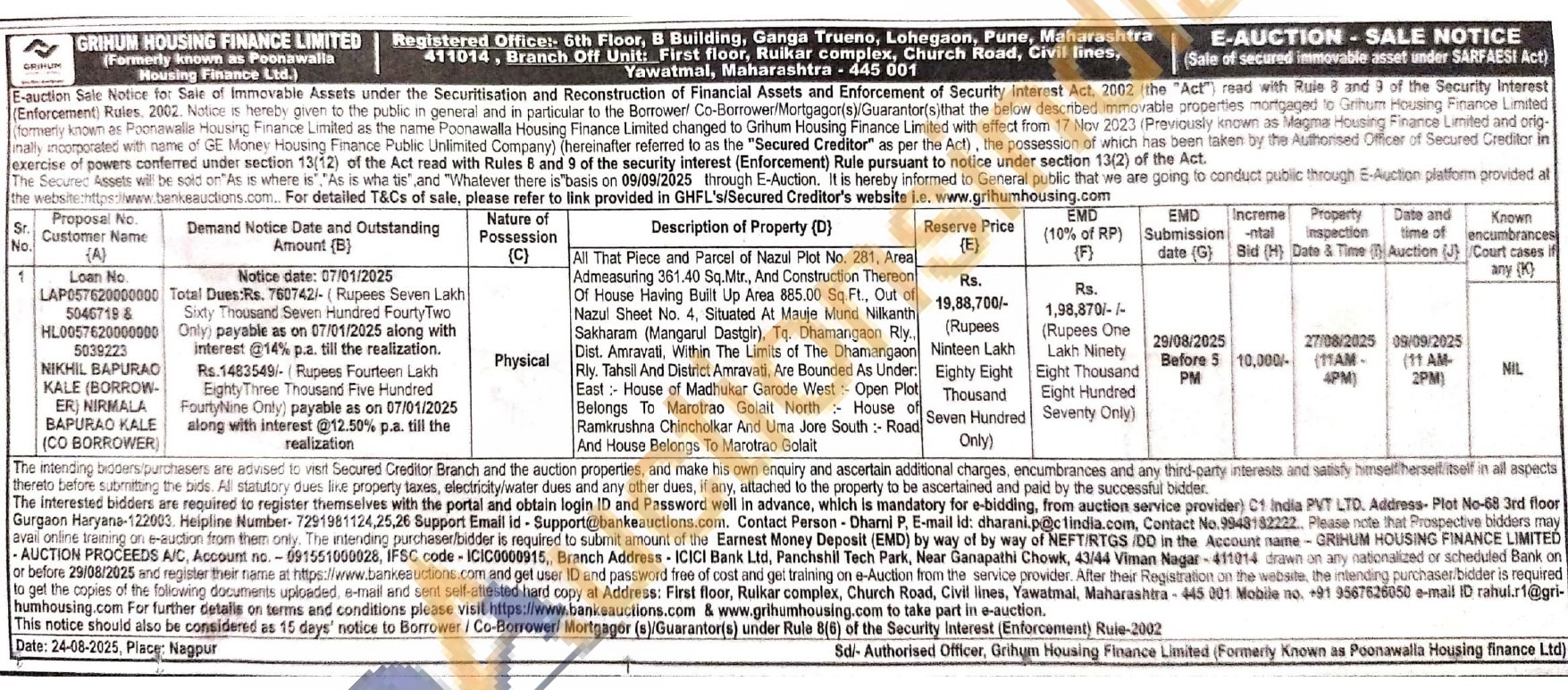All That Piece and Parcel of Nazul Plot No. 281, Area Admeasuring 361.40 Sq.Mtr., And Construction Thereon Of House Having Built Up Area 885.00 Sq. Ft., Out of Nazul Sheet No. 4, Situated At Mauje Mund Nilkanth Sakharam (Mangarul Dastgir), Tq. Dhamangaon Rly.. Dist. Amravati, Within The Limits of The Dhamangaon Rly. Tahsil And District Amravati, Are Bounded As Under: East House of Madhukar Garode West: Open Plot Belongs To Marotrao Golait North House of Ramkrushna Chincholkar And Uma Jore South Road And House Belongs To Marotrao Golait