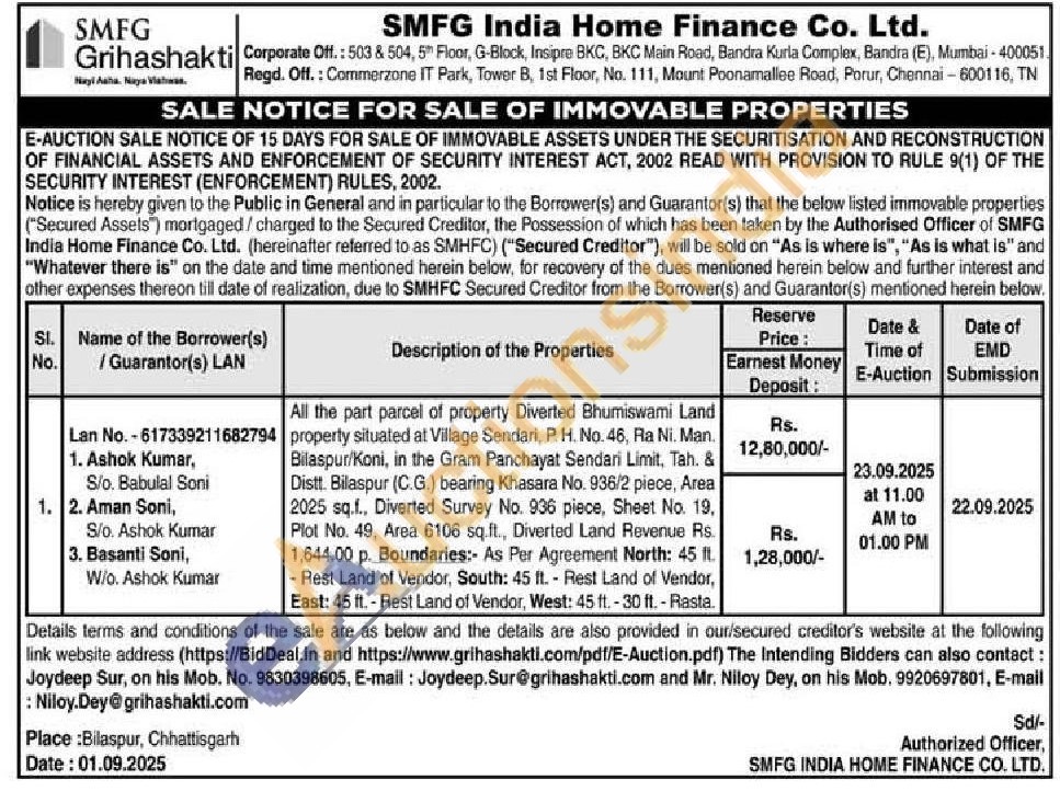 All the part parcel of property Diverted Bhumiswami Land property situated at Village Sendari, P. H. No. 46, Ra Ni. Man. Bilaspur/Koni, in the Gram Panchayat Sendari Limit, Tah. & Distt. Bilaspur (C.G.) bearing Khasara No. 936/2 piece, Area 2025 sq.f., Diverted Survey No. 936 piece, Sheet No. 19, Plot No. 49, Area 6106 sq.ft., Diverted Land Revenue Rs. 1,644.00 p. Boundaries:- As Per Agreement North: 45 ft. -Rest Land of Vendor, South: 45 ft. - Rest Land of Vendor, East: 45 ft. - Rest Land of Vendor, West: 45 ft. -30 ft. - Rasta
