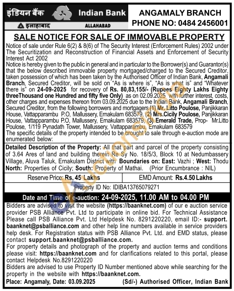 All that part and parcel of the property consisting of 3.64 Ares of land and building therein Re Sy No. 18/5/3, Block 10 at Nedumbassery Village, Aluva Taluk, Ernakulam District with Boundaries on: East: Vazhi: West: Thodu North: Properties of Cicily; South: Property of Mathai. (Prior Encumbrance: NIL)