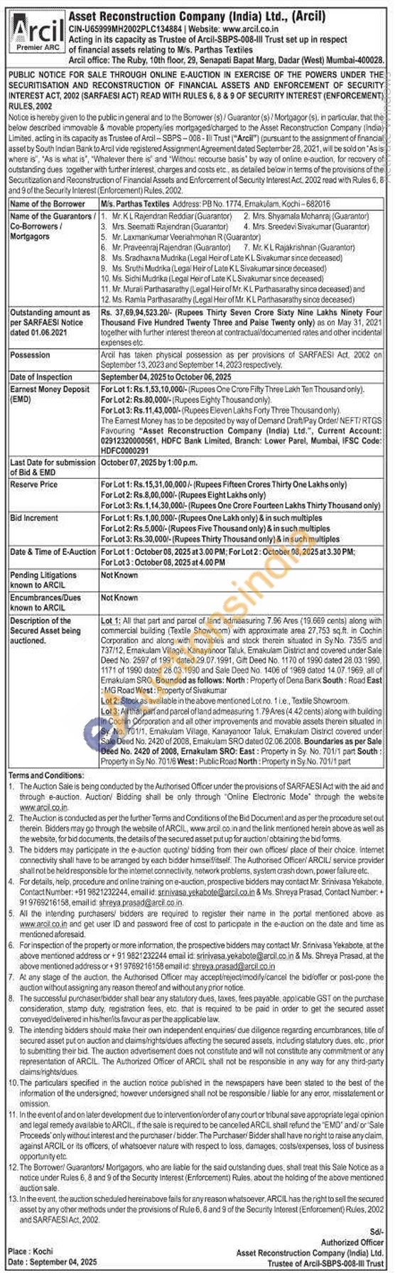 Lot 1: All that part and parcel of land admeasuring 7.96 Ares (19.669 cents) along with commercial building (Textile Showroom) with approximate area 27,753 sq.ft. in Cochin Corporation and along with movables and stock therein situated in Sy.No. 735/5 and 737/12, Ernakulam Village, Kanayanoor Taluk, Ernakulam District and covered under Sale Deed No. 2597 of 1991 dated 29.07.1991, Gift Deed No. 1170 of 1990 dated 28.03 1990, 1171 of 1990 dated 28 03.1990 and Sale Deed No. 1406 of 1969 dated 14.07.1969, all of Ernakulam SRO Bounded as follows: North: Property of Dena Bank South: Road East MG Road West: Property of Sivakumar