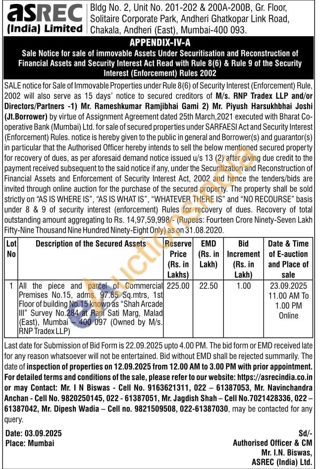 All the piece and parcel of Commercial Premises No.15, adms. 97.85 Sq.mtrs, 1st Floor of building No. 15 known as "Shah Arcade III" Survey No.284 at Rani Sati Marg, Malad (East), Mumbai 400 097 (Owned by M/s. RNP Tradex LLP)