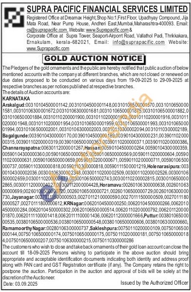 SUPRA PACIFIC FINANCIAL SERVICES LIMITED Gold Auctions Auction in Hassan