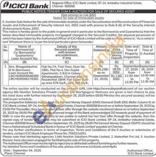 Flat No.7A, First Floor, Door No. 1881, Plot No.4, Dev Gupta Apartments, C.B.O.A Colony, Sithalapakkom, Chennai-600124 Residential 18HK Flat Super Built-up area 578 Sq.ft., UDS 289 Sq.ft