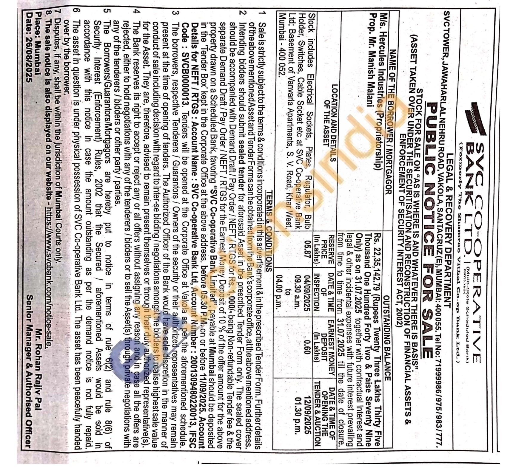 Stock includes Electrical Sockets, Plates, Regulator, Bulb Holder, Switches, Cable Socket etc at SVC Co-operative Bank Ltd; Basement of Vanvaria Apartments, S. V. Road, Khar West, Mumbai-400 052.